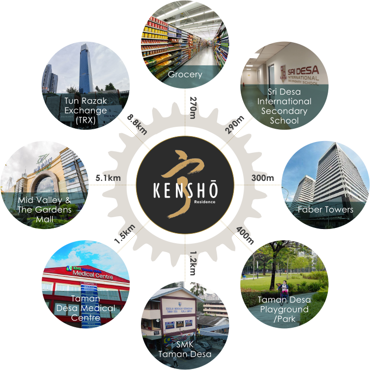 Situated in a mature neighborhood, Kensho Residence is close to community spaces, top schools, Taman Desa Medical Centre, Mid Valley Megamall, and The Gardens Mall, offering diverse dining and shopping options.